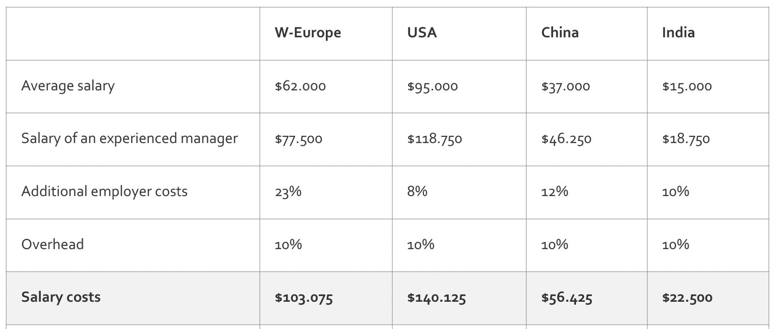 In addition to salaries, employer costs such as insurance or taxes vary by country. When calculating travel expenses, you should consider not only flights, hotels, taxis, and meals but also the value of the export manager’s time. The hourly cost of an export manager traveling approximately six times a year is about $113 USD in the US, around $90 USD in Western Europe, $61 USD in China, and $40 USD in India.